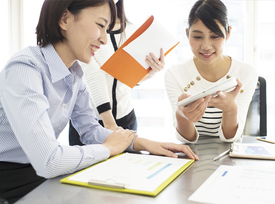 派遣スタッフ1人に対して同じ部署の先輩職員(社員)がサポートにつき、本人の能力や経験に応じて仕事の進め方を教えます。紹介予定派遣で就業したスタッフが管理職になったケースも。長く働くことを見据えて成長できる環境です。