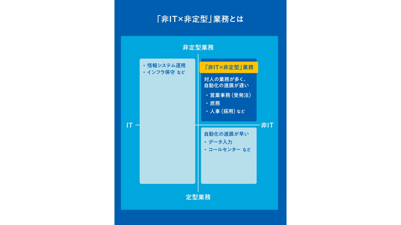 「非IT業務には2種類あり、コールセンターや金融機関における事務センターが担う『定型』的な業務は、マニュアル化しやすく、アウトソーシングもしやすい。非IT分野で効率化から取り残されやすいのは、『非定型』の業務です」(野々山氏)