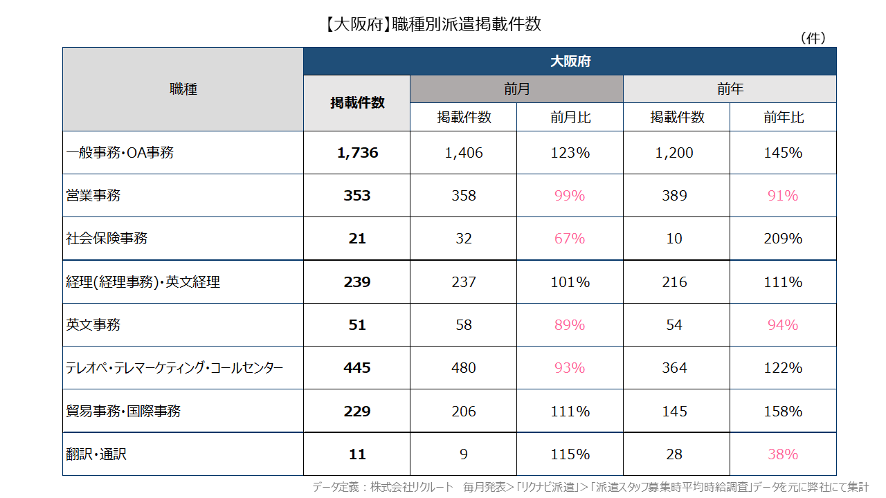 【大阪府】職種別派遣掲載件数および平均スタッフ時給