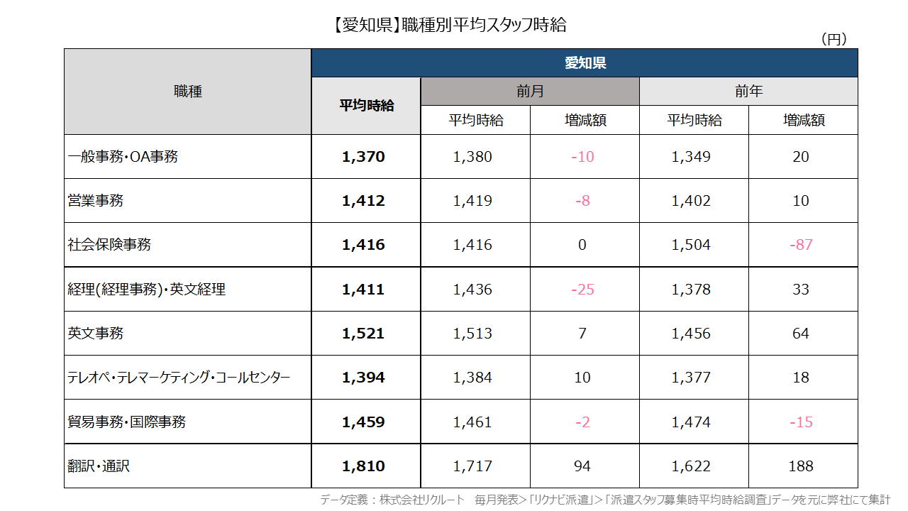 一方、愛知県の平均スタッフ時給は前月比で下落した職種が多くみられました。例えば、最も掲載件数の多い一般事務・OA事務は、前月比ー10円でした。ただし、前年同月比では、+20円の増加でした。