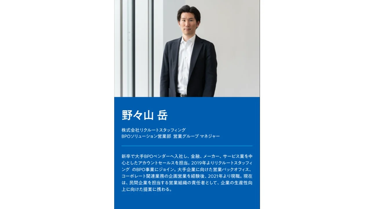 私たちの仕事には、大別して2種類がある。事業成長の核となる「コア業務」と、事業戦略に直結しない「ノンコア業務」だ。 「社員はコア業務に集中し、ノンコア業務はデジタルツールなどを導入して効率化すべき」というのが定石だが、思い返してみてほしい。 ノンコア業務の中で、自動化もできず、マニュアル化もしにくいため、人に任せることもできず、「これは自分でやるしかないな」と諦めている仕事があるのではないだろうか。 そんな「非IT×非定型」とも呼ぶべき業務の効率化に強みを持つのが、リクルートスタッフィングのBPO(ビジネス・プロセス・アウトソーシング)だ。 具体的にどのような活用事例があるのか。その結果、どれほど企業の生産性は上がったのか。BPOソリューション営業部の野々山岳氏に話を聞いた。