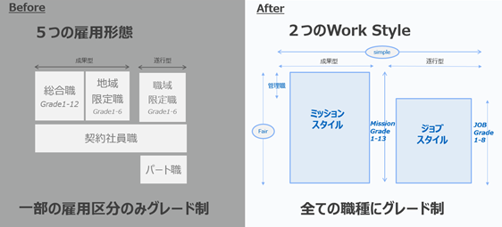 5つあった雇用区分を、ミッションスタイル(成果型)とジョブスタイル(遂行型)の2つに再編し、処遇を統一いたしました。