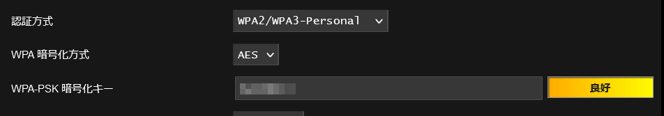 認証方式(パソコンから接続した場合における「セキュリティの種類」)は、「WPA3〜」あるいは「WPA2〜」がセキュリティ対策としては望ましい。なお、Wi-Fi接続機器(パソコンやスマートフォンなど)が最新の認証方式をサポートするとは限らないため、最終的には環境任意の設定になる。