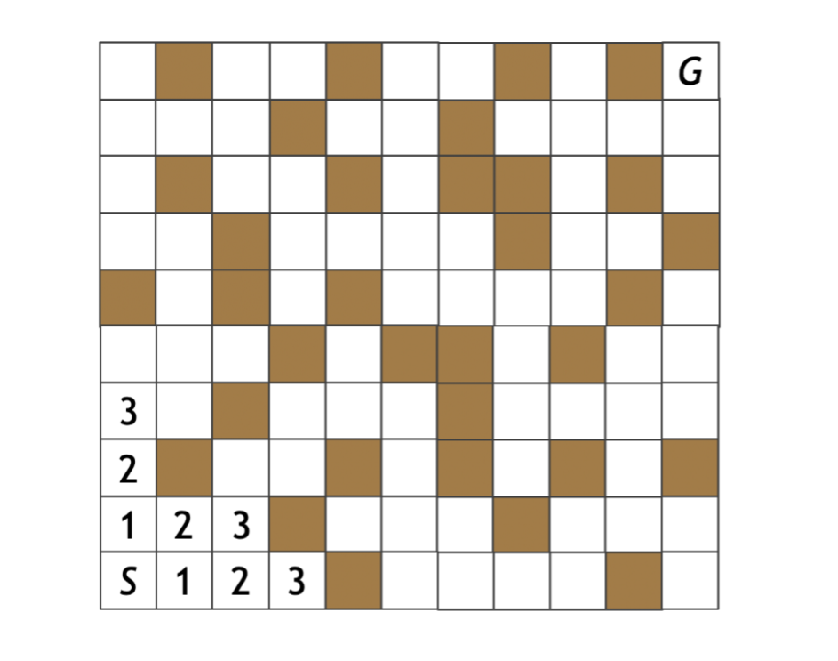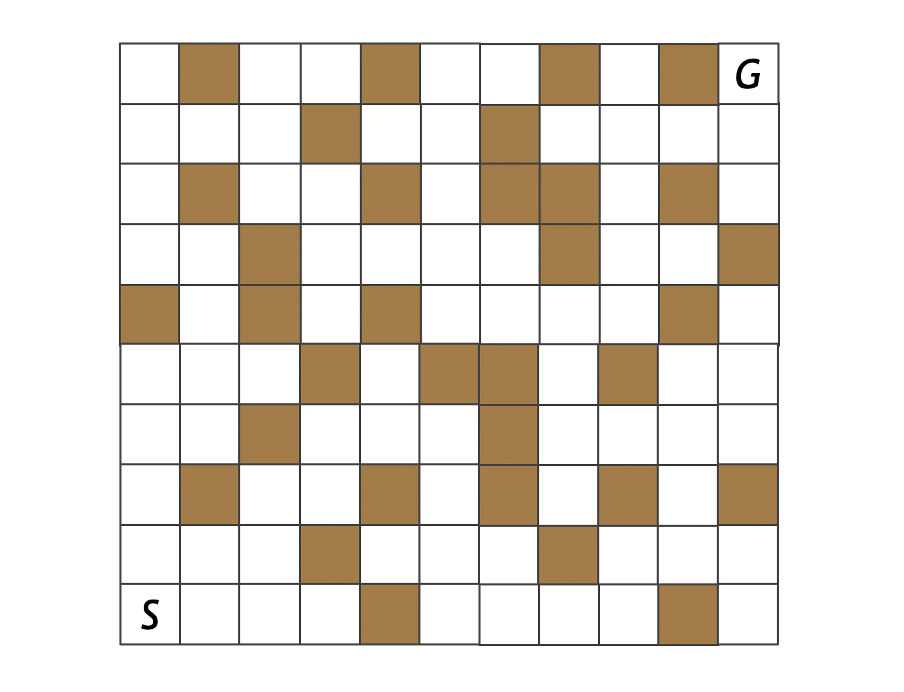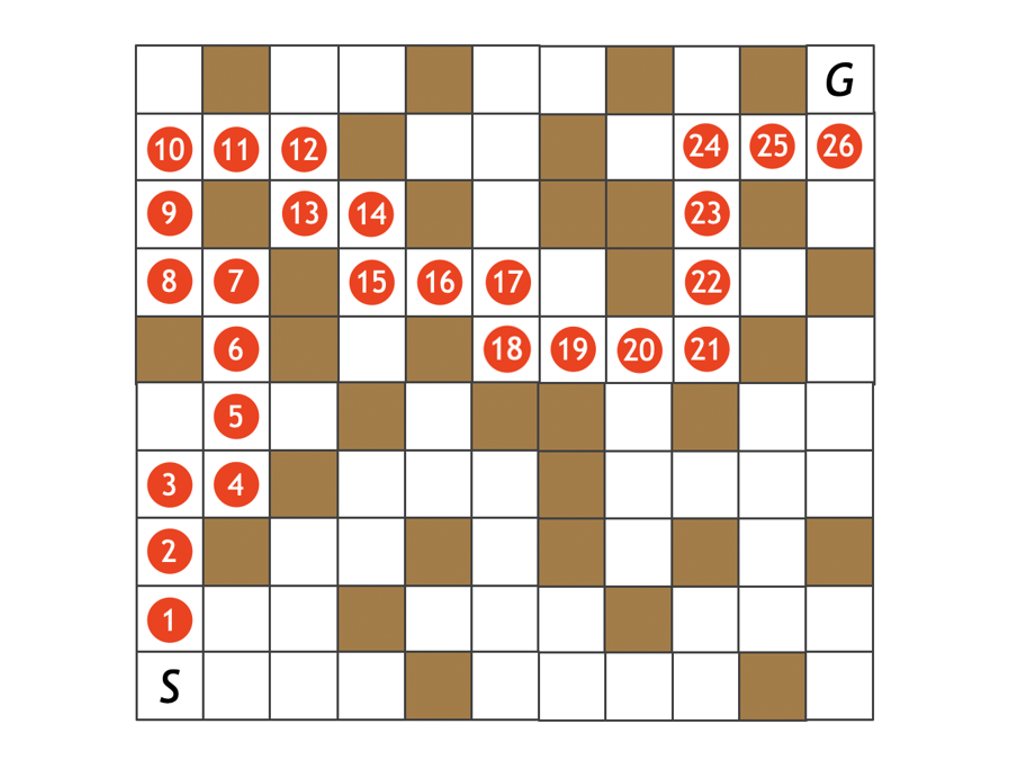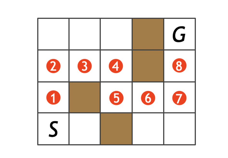 スタート(S)からゴール(G)まで行きたいとします。1回の移動では、現在いるマスから、隣接する上下左右のマスに移動することができます(これを1手とします)。ただし茶色のマスは壁を表しており、入ることができません。