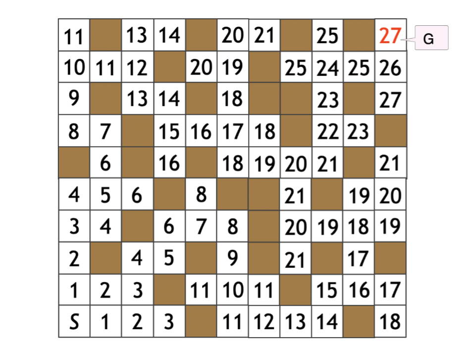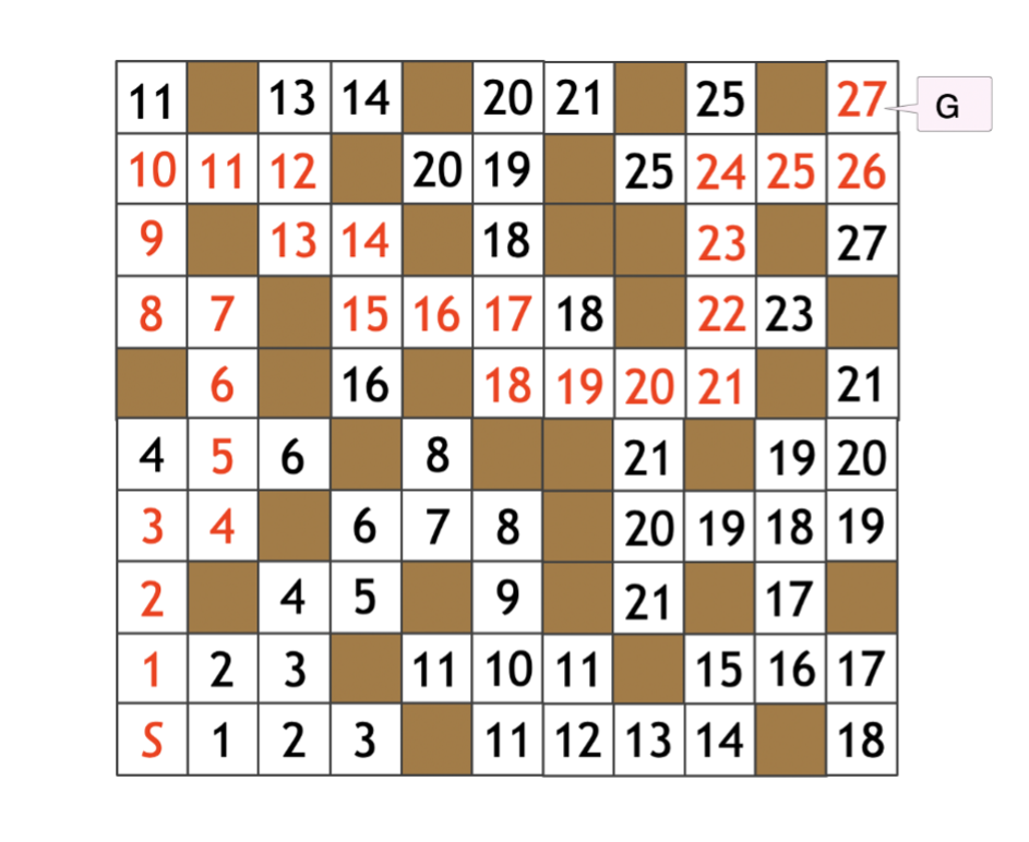 なお、具体的な最短経路は下の図のようになります。今度はGのマスから出発して、書かれた数が1ずつ下がっていくようなマスを選んでいくことで、具体的な最短経路を求めることができます。