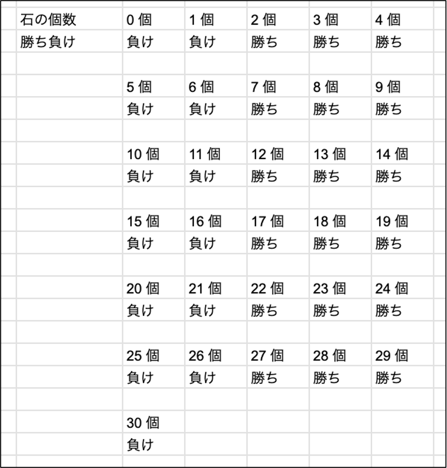 N = 0,1,2,3,4 の場合について、石の個数がN個の状態の勝ち負けを整理すると、下の表のようになります。