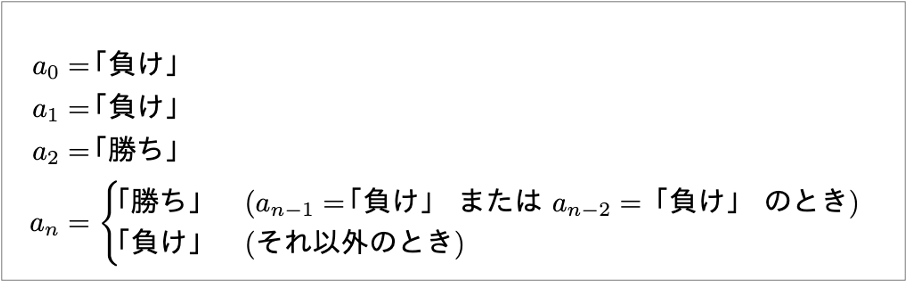 今回のゲームの勝敗を求めた方法は、次のような「漸化式」を立てて解いたものとみなすことができます。漸化式は、数学Bの単元「数列」で登場するものですね。