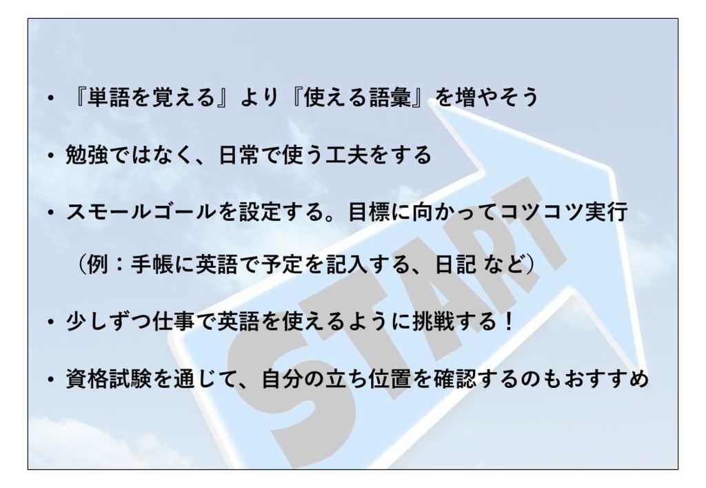 サリーさんは次に、英語を日常に取り入れる5つのアイデアを紹介しました。
