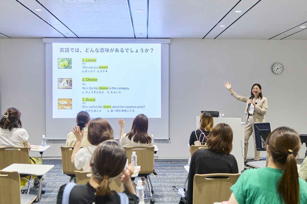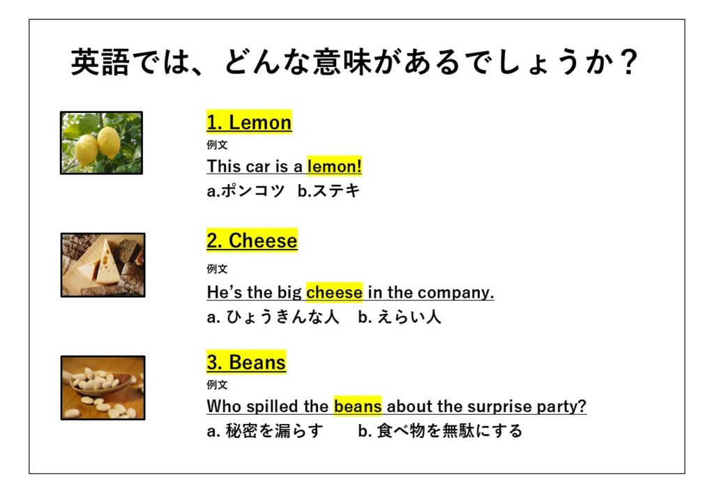 レモンやチーズ、ビーンズというおなじみの食べ物が出てくる文章について、2つの選択肢から回答を選び、手を上げてもらいました。なかなか正解率が低く、思ってもいない意外な意味に会場が盛り上がります。