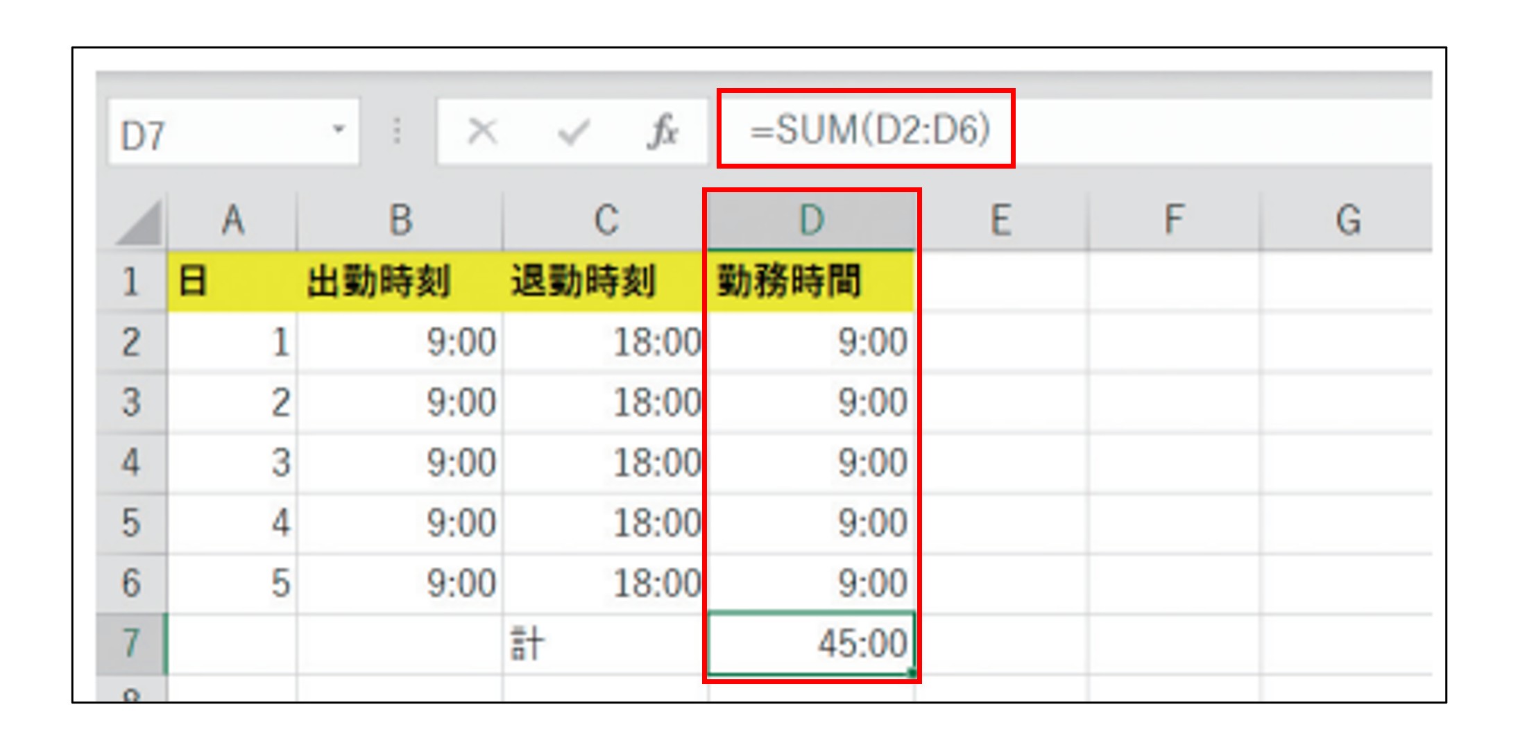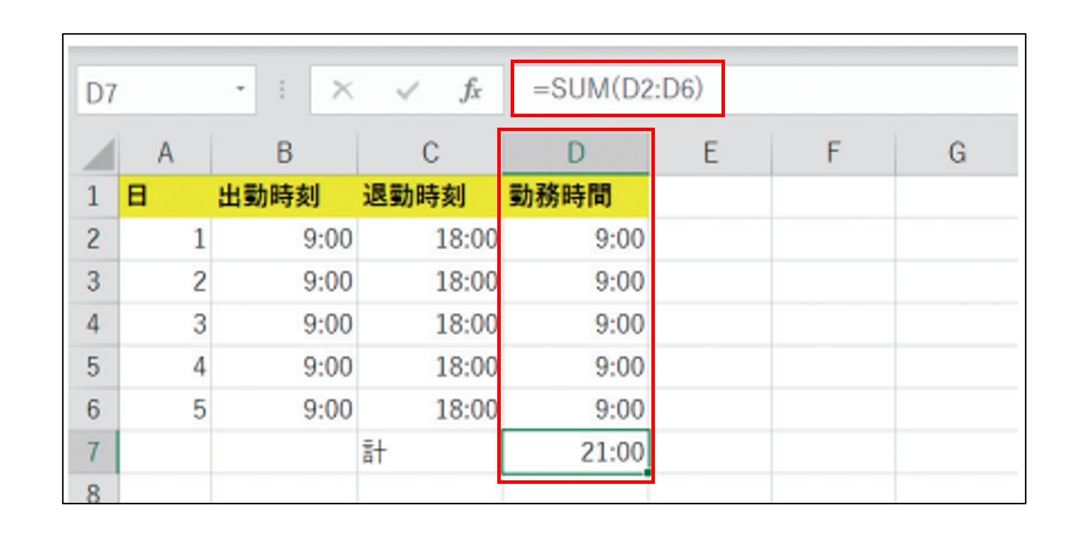 合計は9時間×5ですから、45時間となるはずです。しかし、D7セルには「21:00」と表示されています。
