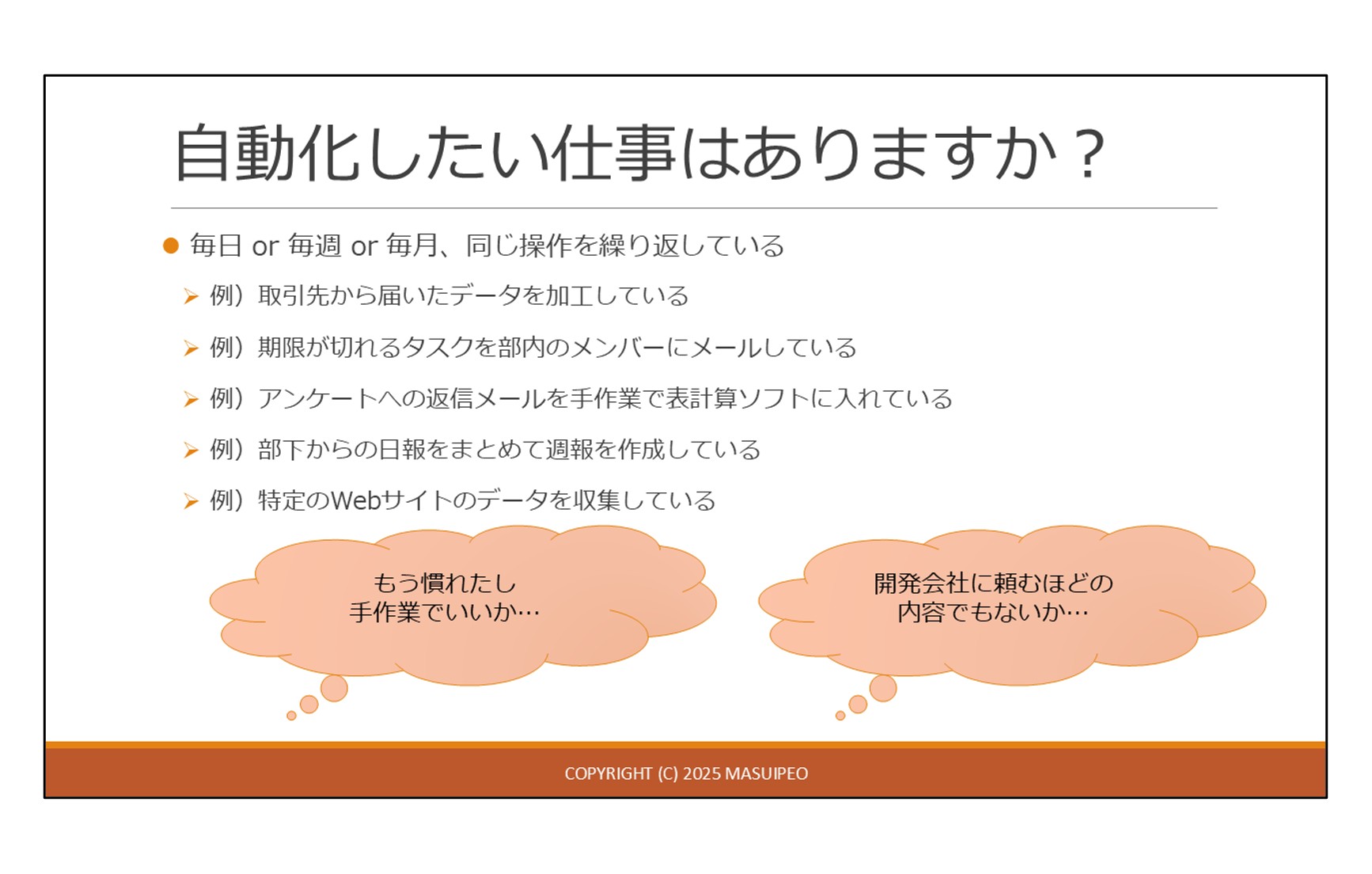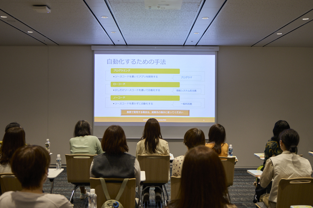 セミナーの冒頭で、「皆さん、仕事の中で自動化したいと思ったことはありますか」と参加者に問いかける増井さん。毎日、毎週など、頻繁に同じ作業を繰り返している方は、自動化したいと考えているのではないでしょうか。