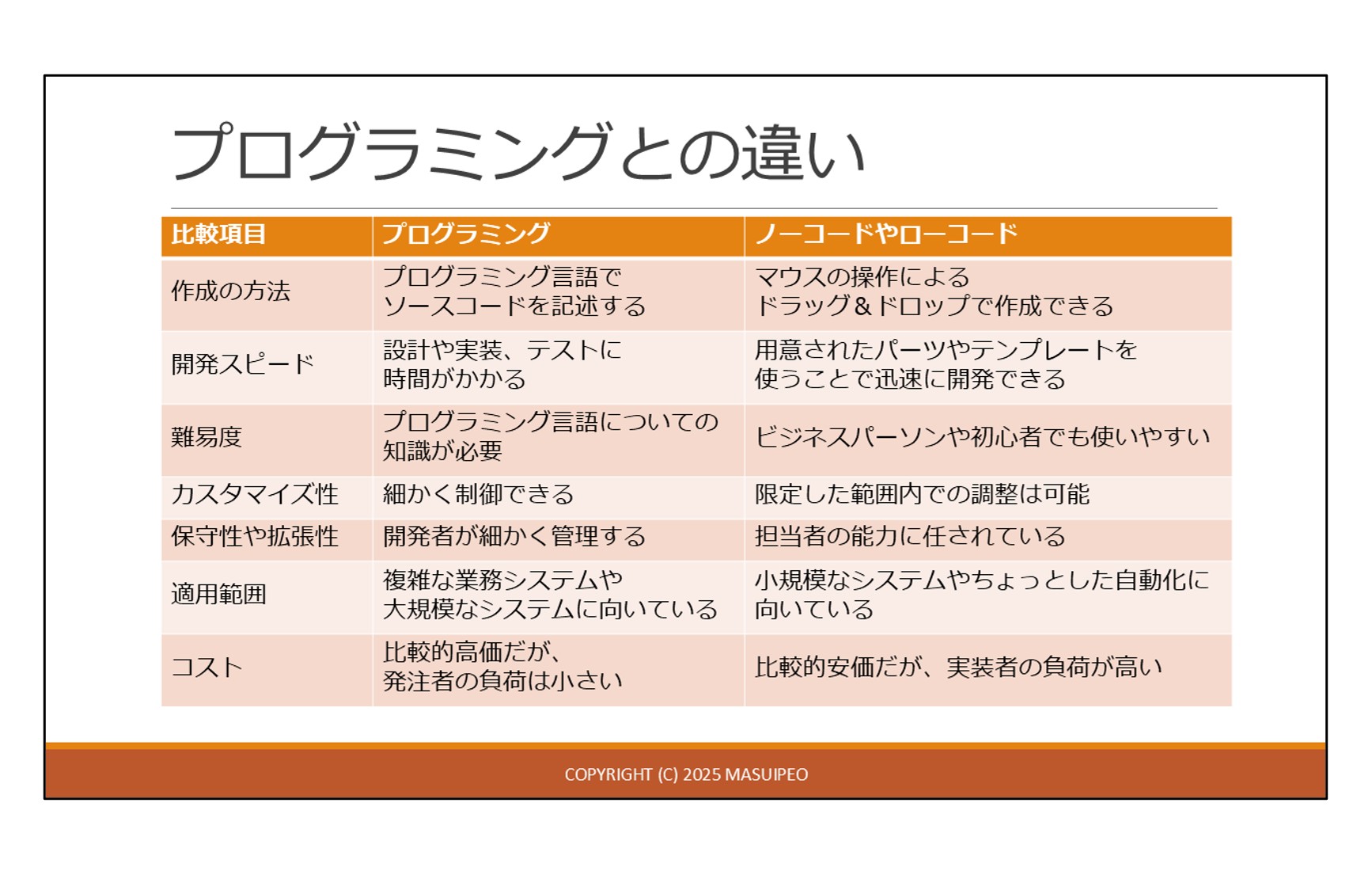 「ローコードやノーコードは、プログラミングの知識がない人でも、慣れれば活用できます。一方で、細かいカスタマイズができるプログラミングと違い、ローコードやノーコードは基本的に用意されているものを使います。さらに、保守や拡張という面で、プログラミングは基本的に開発者が管理しますが、ローコードやノーコードは作った方が管理しなければなりません」
