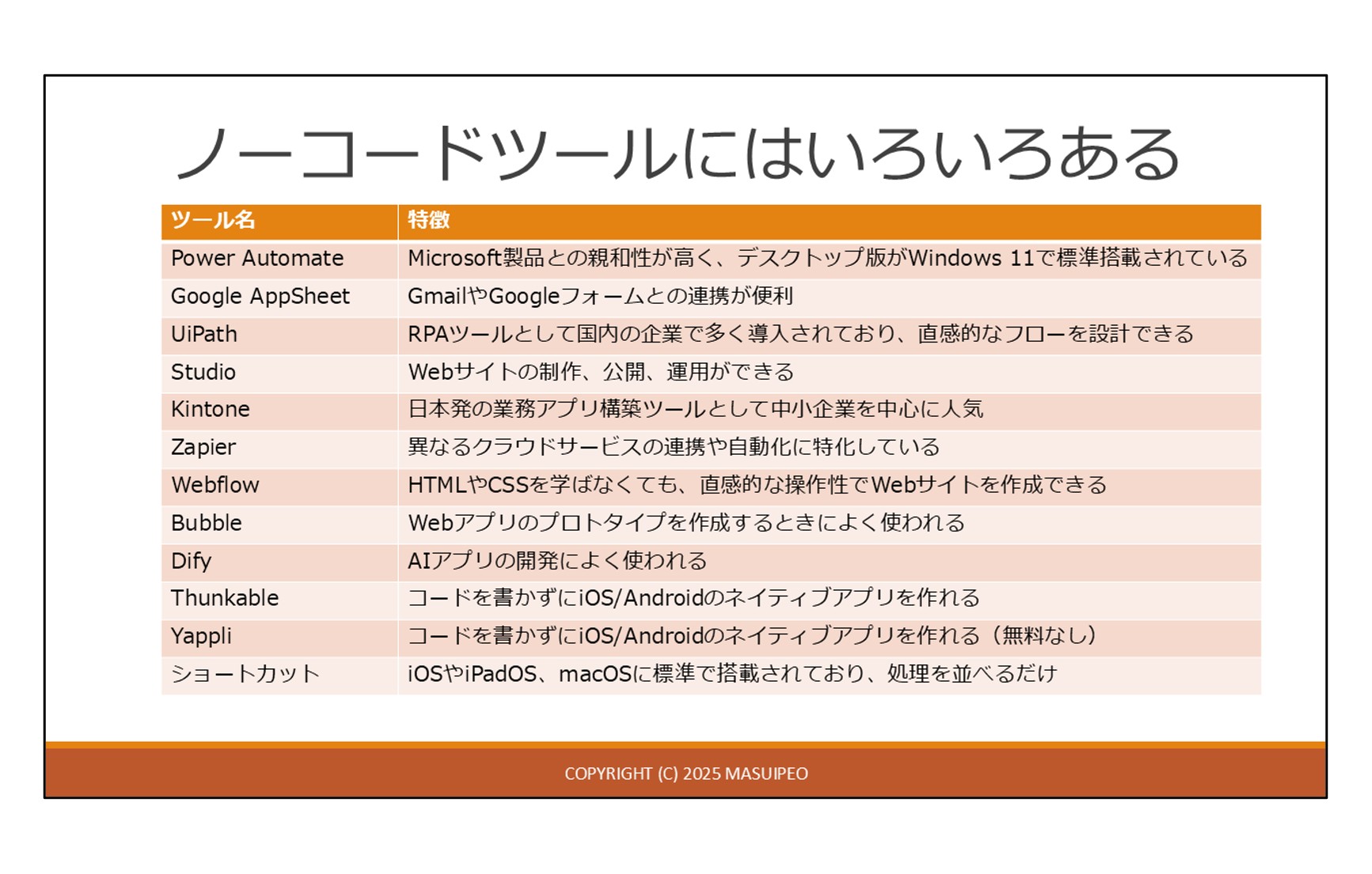 他にも、Slackに通知するためのZapierや、Webサイトから情報を自動で抽出(スクレイピング)するためのPower Automate Desktop、Webから入力してデータベースを作るためのKintoneなどを紹介しました。