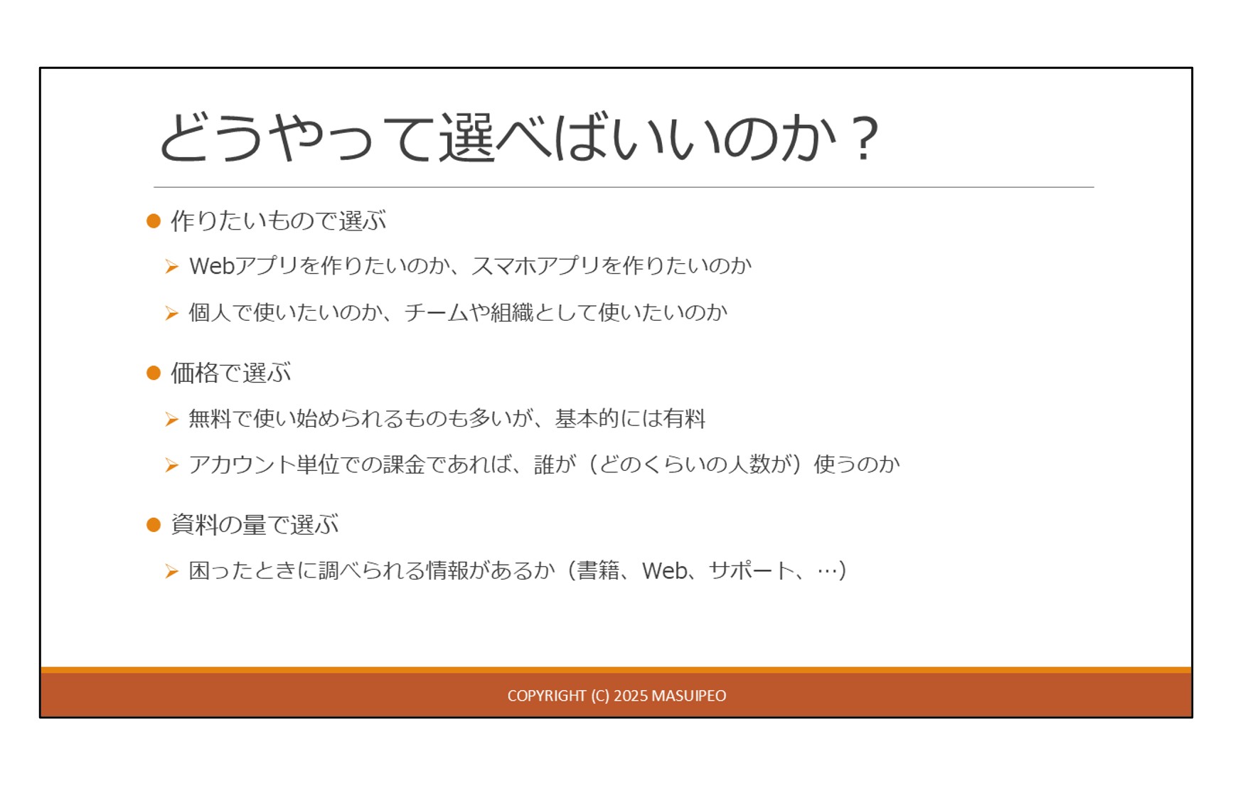 「作りたいもの」によって適したツールを選ぶ必要があります。また「値段」も大切です。利用する人数に応じて金額が変わったり、使っていないのに課金が発生し続けたりする場合があります。資料や書籍があるか、詳しい人が周りにいるかなど、「情報やサポートの量」も確認しましょう。