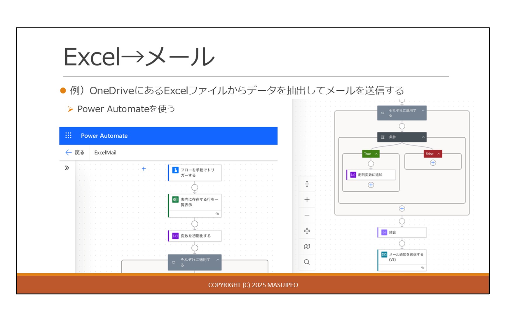 例えば「OneDrive上にある『Excelで作成したタスクリスト』の中に未完了の項目があったら、担当者にメールで通知する」といった処理も自動で実行できます。