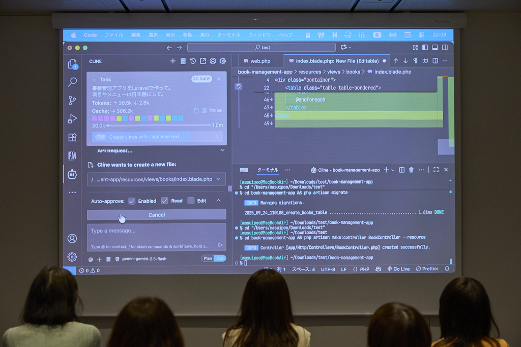 増井さんがそう説明している間に、画面上ではソースコードが自動でどんどん書かれていきます。作業フローの設定などは不要で、ただ日本語で指示しただけです。