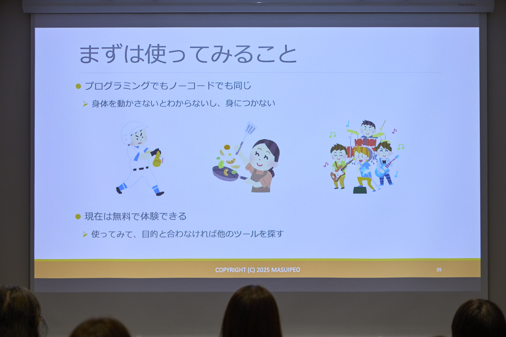 「ノーコードも、他のITツールやプログラミングと同じように、とにかく使って触ってみなければわかりません。自分で触りながら、書籍や公式サイトを参照にして作ってみるのが一番です。また、オンラインの講座やUdemy、YouTubeなどの動画でも学べます。質問したい場合にはコミュニティへの参加も検討してみましょう」