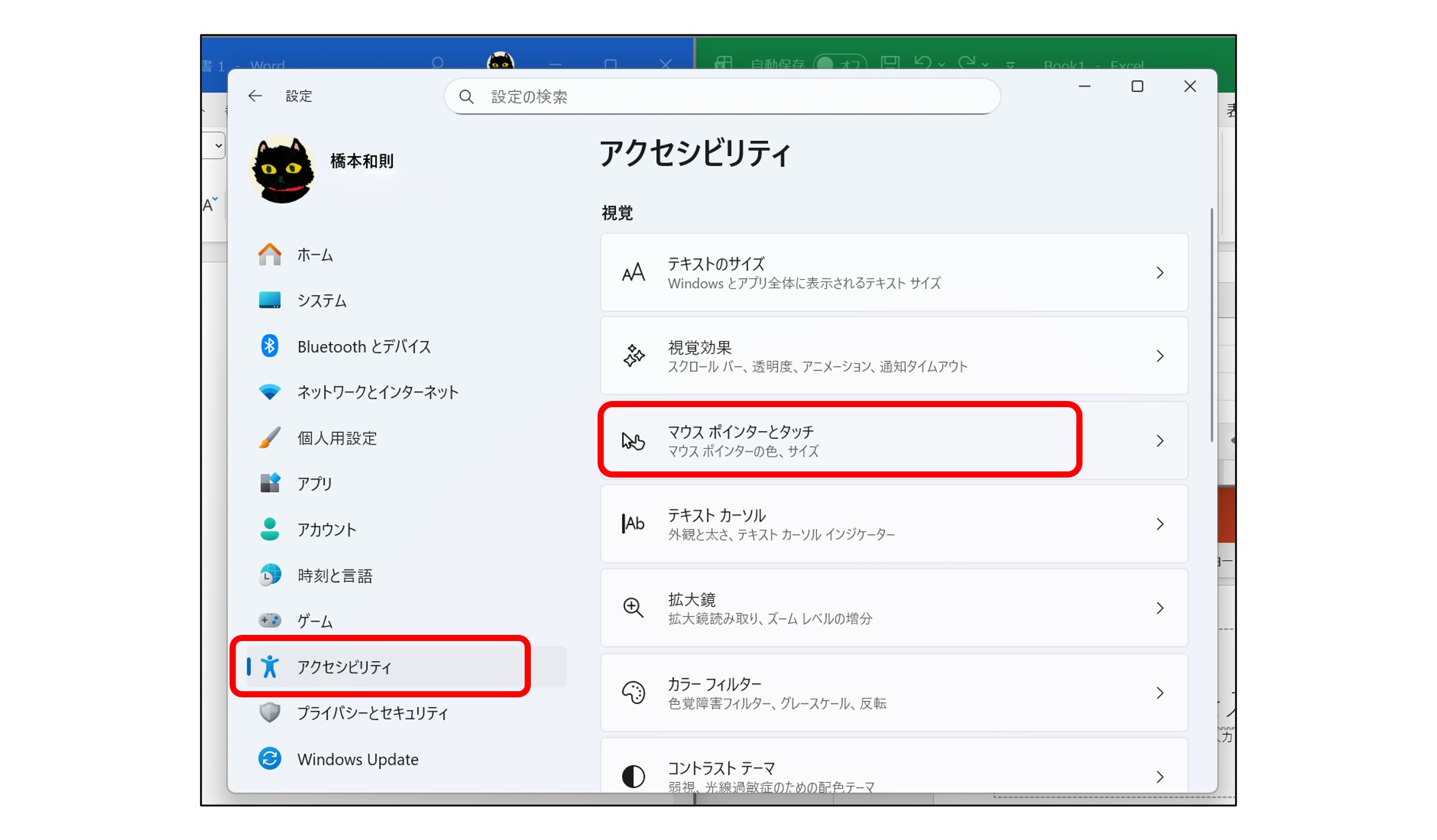 ▲「設定」から「アクセシビリティ」→「マウスポインターとタッチ」を選択。