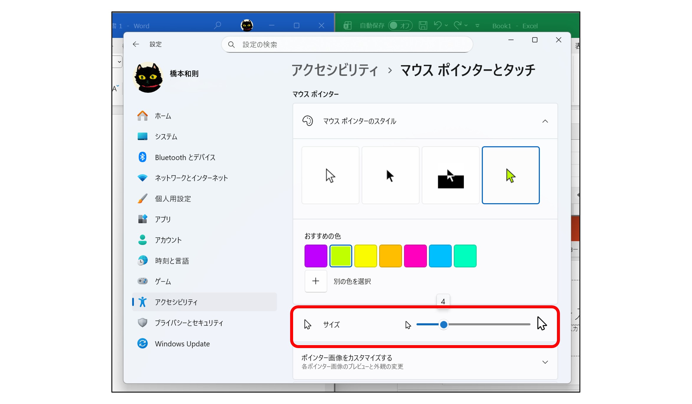 「サイズ」のスライダーで、マウスポインターの大きさを設定できるほか、「マウスポインターのスタイル」でポインターの色を変更することもできます。
