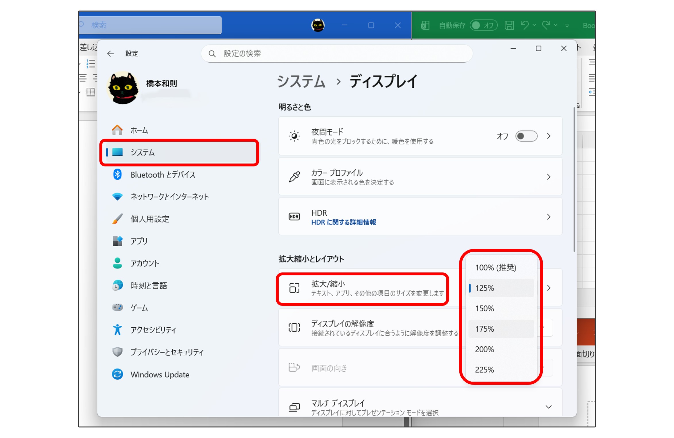 「設定」から「システム」→「ディスプレイ」を選択して、「拡大縮小とレイアウト」欄にある「拡大/縮小」のパーセンテージを変更すると、拡大率を変更することができます。