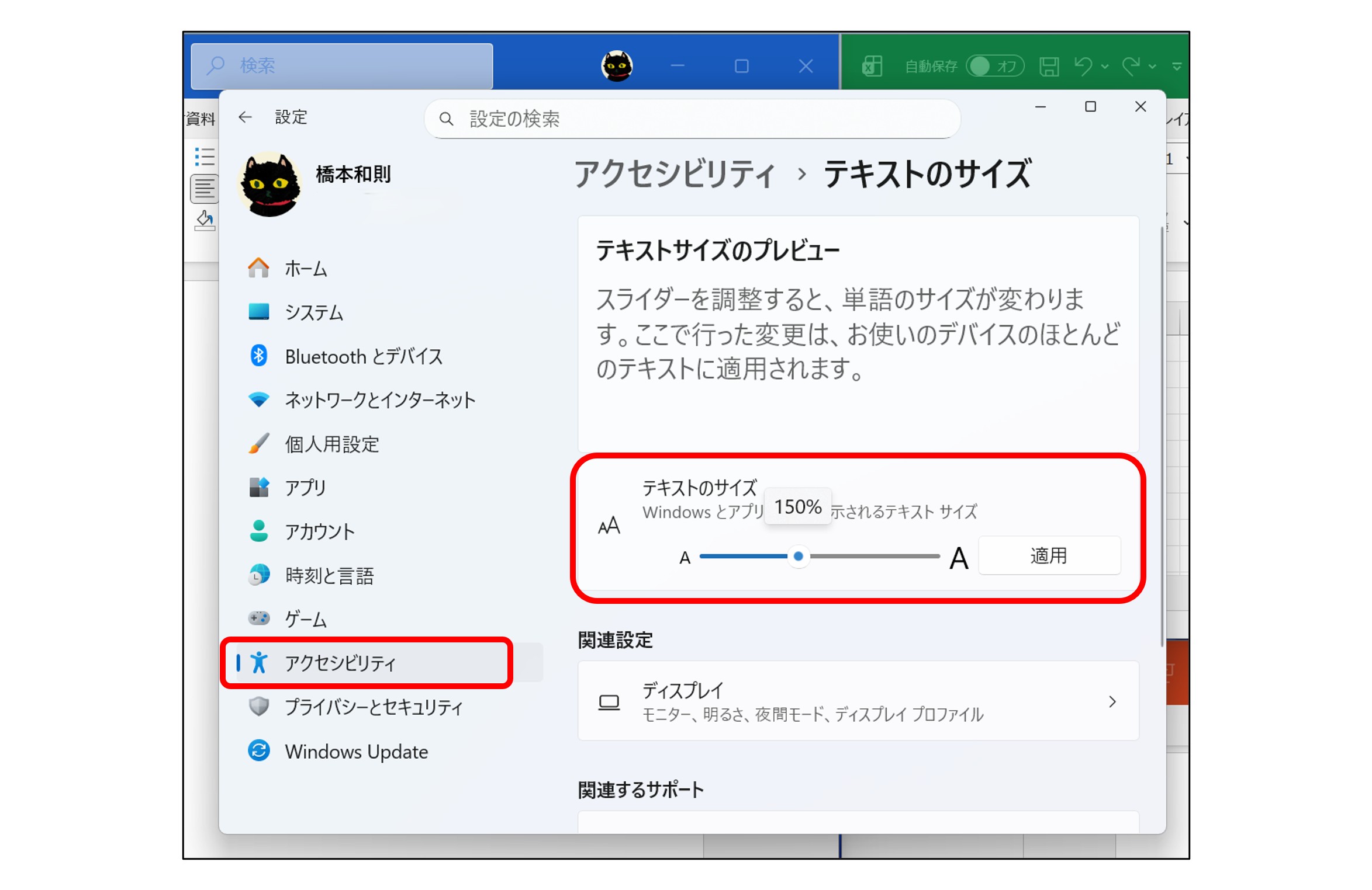 ウィンドウのサイズなどは基本的にそのまま、デスクトップ上で見えにくい「文字」のみを拡大して表示したい場合には、「設定」から「アクセシビリティ」→「テキストのサイズ」を選択して、「テキストのサイズ」欄にあるスライダーで調整して、「適用」をクリックします(文字が表示しきれないなどの現象が出た場合には要再起動)。