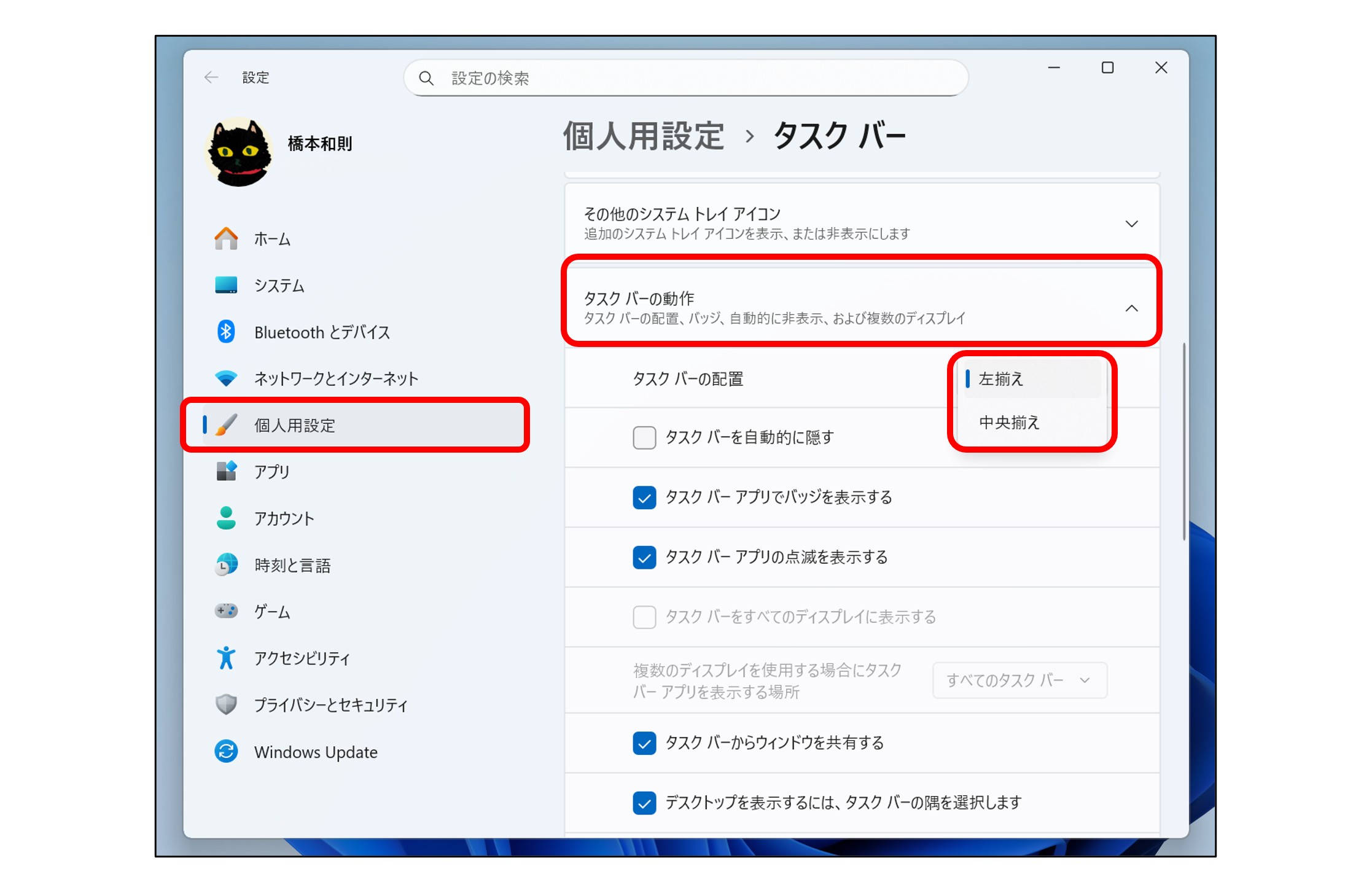 展開されたメニュー内、「タスクバーの配置」のドロップダウンから「左揃え」を選択すればOKです。