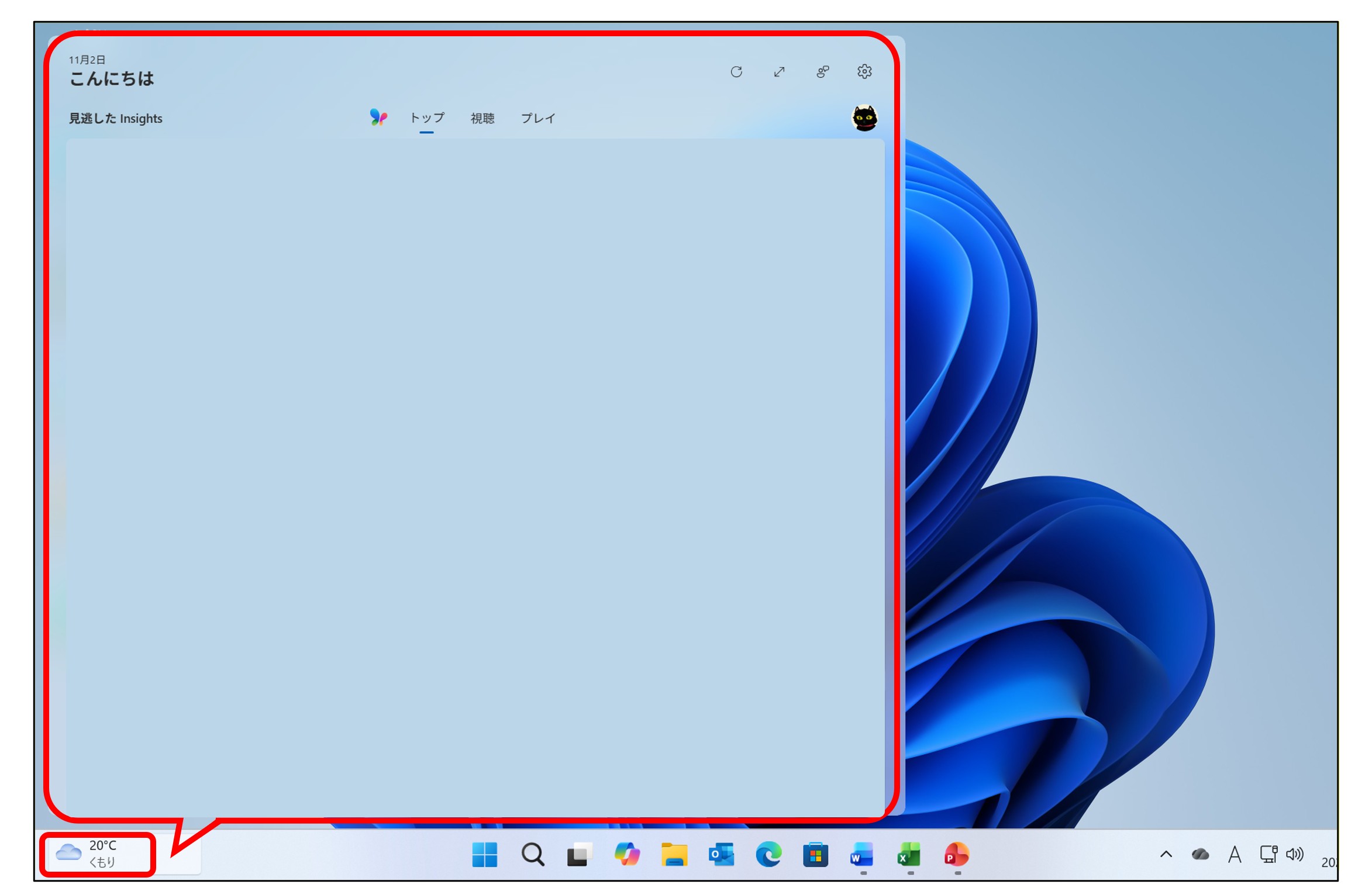 なお、タスクバーの「ウィジェット」ボタンを非表示にしても、ショートカットキー「Win」+「W」でウィジェットは表示することができます。