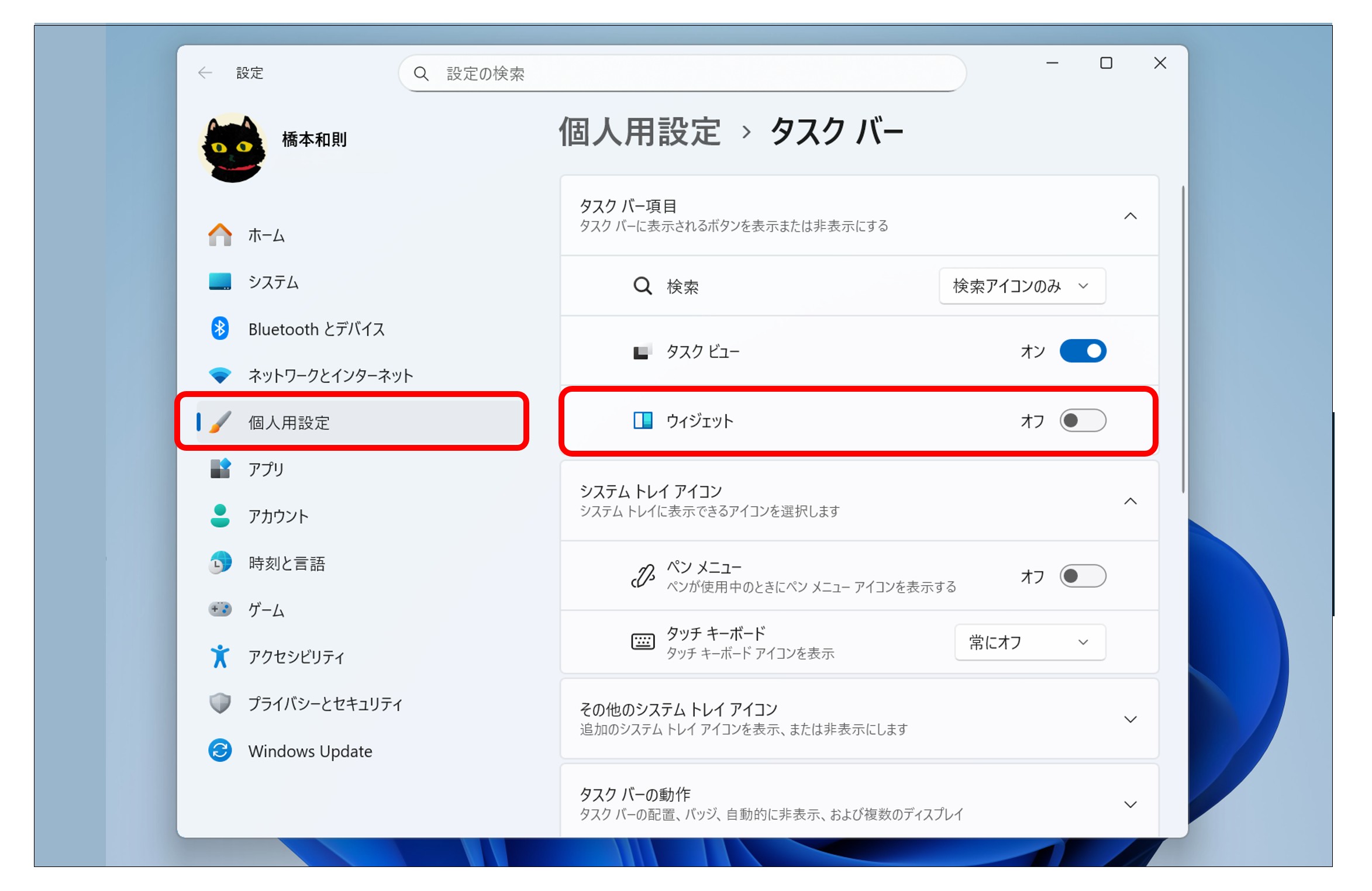 ▲「設定」から「個人用設定」→「タスクバー」を選択して、「タスクバー項目」欄にある「ウィジェット」をオフにすれば、タスクバーの「ウィジェット」ボタンを非表示にできる。