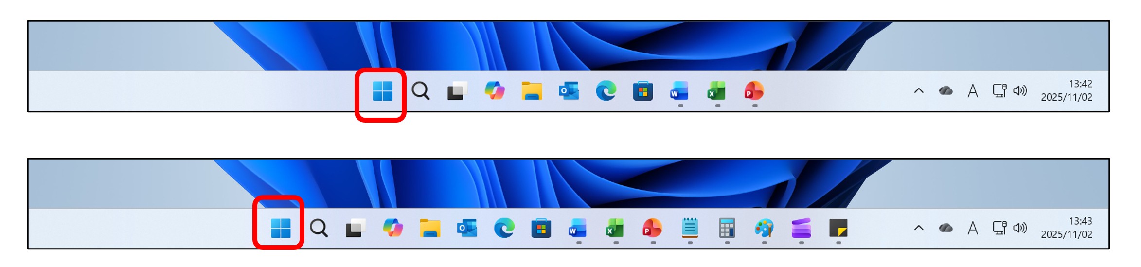 Windows 11の[スタート]ボタンは「すべてのタスクバーアイコンをセンタリングした状態における左側」に配置されますが、これはタスクバーアイコンが増えると、位置が可変する仕様ともいえます。