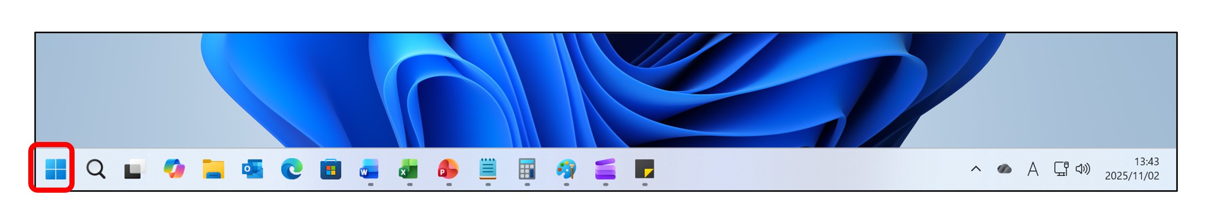 ▲Windows 11標準状態のタスクバー。タスクバーアイコンの数に応じて、[スタート]ボタンの位置が移動する仕様だ。
