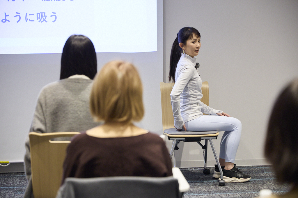 イベントの参加者は仕事帰りの方がほとんど。デスクワークで疲れた体をほぐすため、まず実施したのは深呼吸。「5秒かけて息を吸い、5秒間止めて、6~7秒かけて息を吐く」を何度か繰り返しました。