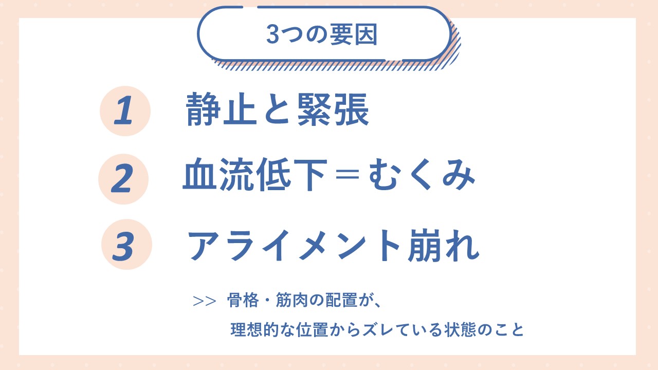 リラックスした状態になったところで、座っているだけなのに疲れる3つの要因を説明していきます。