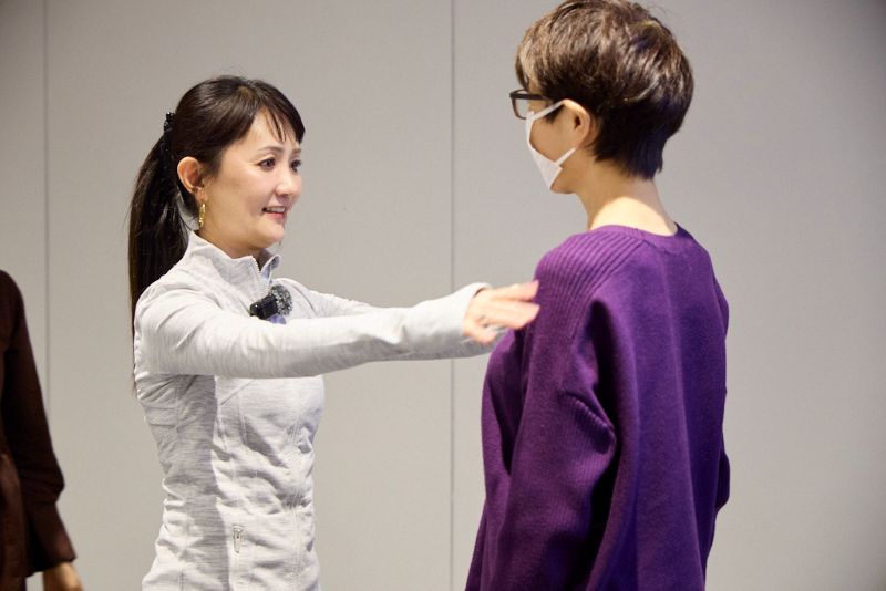 さらに、2人1組になって、相手の肩首の傾きをチェック。相手の姿勢を見てどちらの肩が下がっているか確認します。