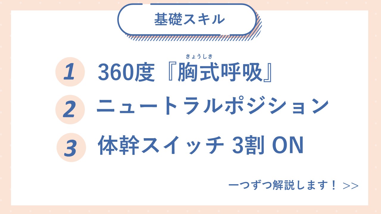 基礎スキルの3つ目は「体幹スイッチ3割ON」です。体幹スイッチを入れる動きのうち、「3割だけでもONにする」方法を紹介しました。座っているときに骨盤を前に倒したり後ろに倒したりせず、前後の両方で支えるようにします。