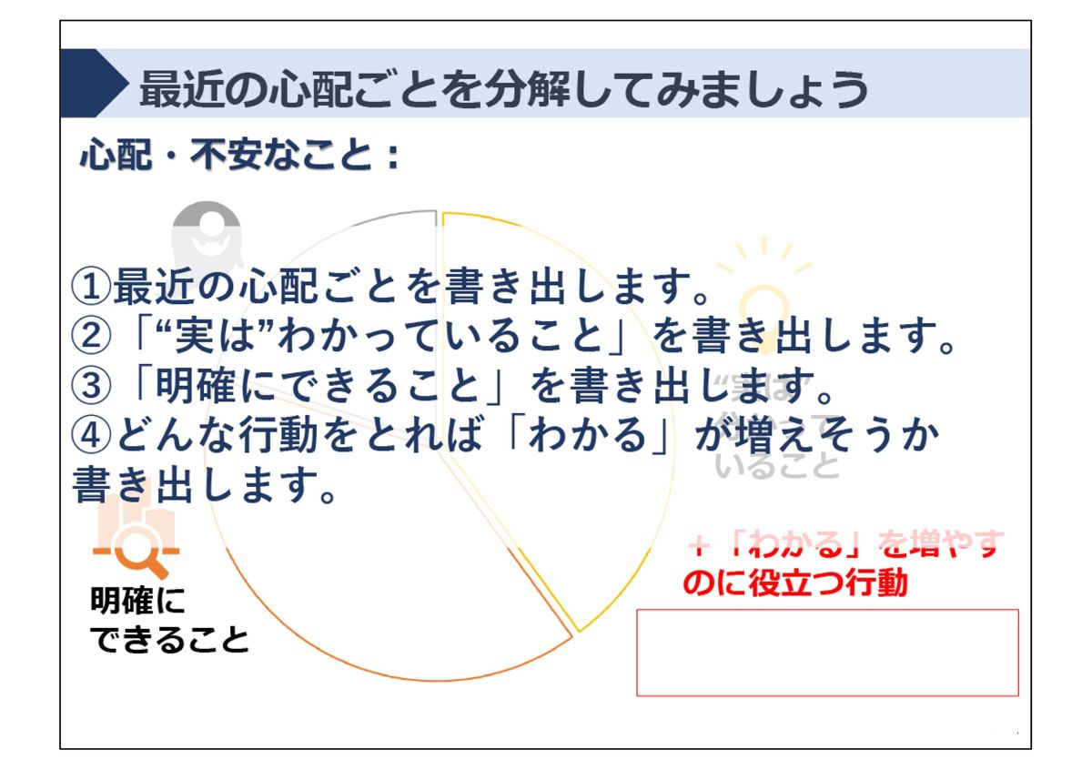 「書き出す」場合には、「実はわかっていること」「明確にできること」を書き出していきます。全部わからないと思っていたが、「わかっていること」もあると気が付き、これから「わかる」に変えていけることも明確になります。