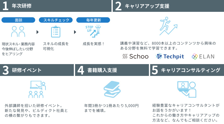 BUILDICTでは、入社する皆さんが配置先での業務を通じて、配置先業務の成果向上に繋がる自律的なアプローチをしていただくこと、ご自身のスキルアップ・キャリアアップをしていただくことを期待しています。無期雇用における長期的なキャリア形成を念頭に、変化していくITエンジニアに求められるスキル・スタンス習得のサポートとして、充実した研修や学習支援をご用意しています。