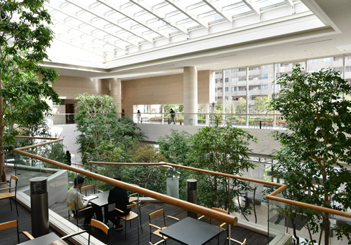 東京メトロ護国寺駅直結の便利なオフィスです。社食とカフェテリアでは、定食メニューのほか、パンやドリンクも揃えています。社食を含む1階から3階までは吹き抜けになっており、緑豊かなリラックススペースとして人気。また、講談社の書籍が無料で読めるスペースも完備されています。